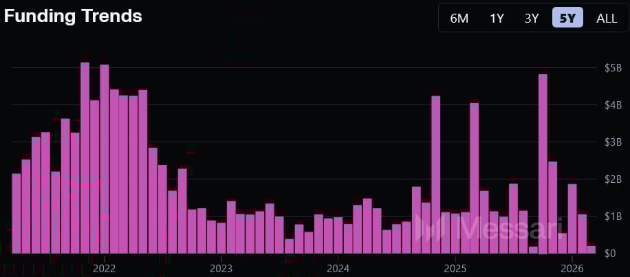 The concentration is wild. In February alone, just three deals accounted for 44% of the $795 million raised that month. Those heavy hitters? Tether's $200M investment into Whop, $75M for sports prediction market Novig (led by Pantera Capital), and $70M for Latin American stablecoin fintech ARQ (backed by Sequoia Capital). Three rounds. Nearly half the month's capital.